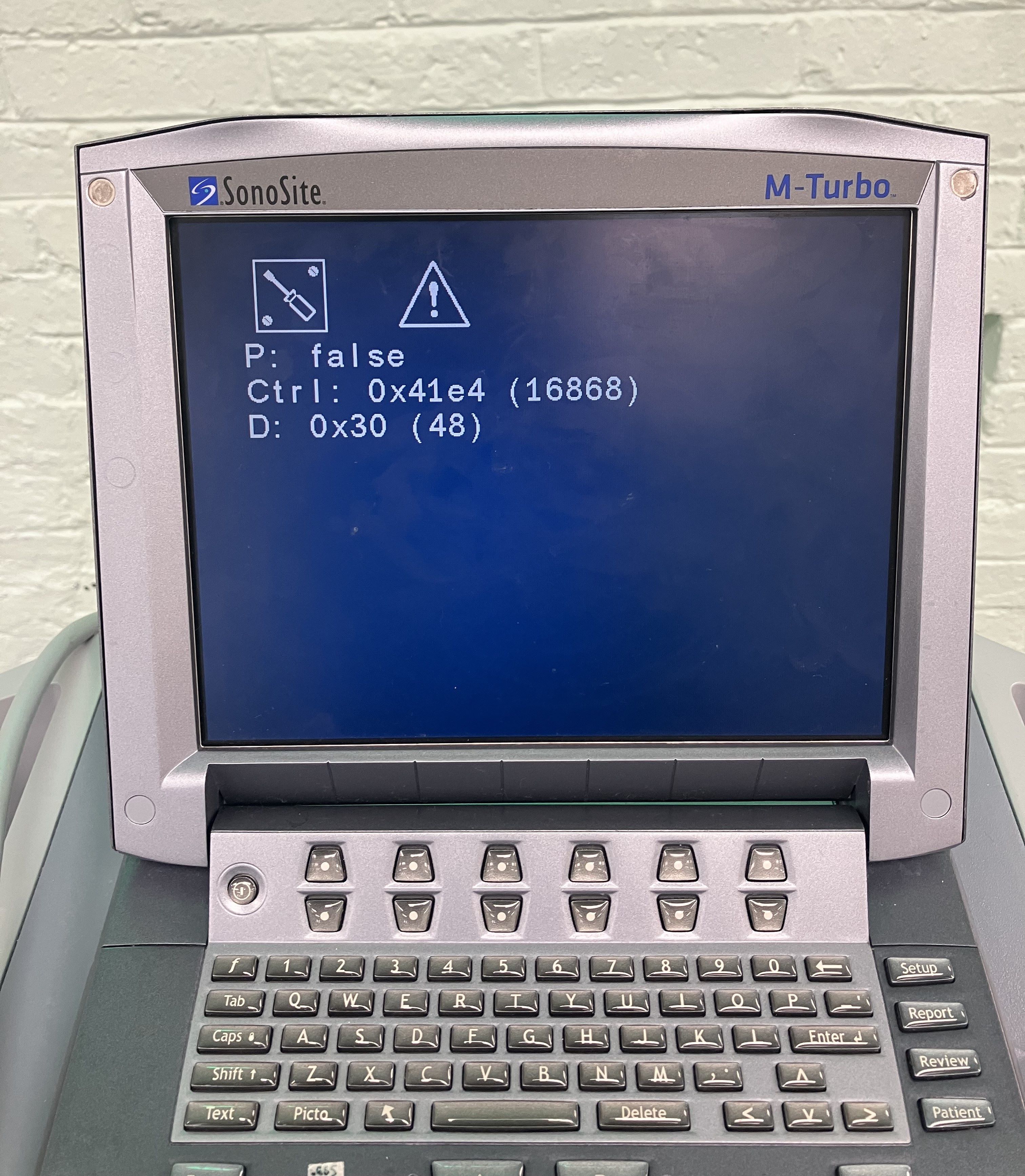 The unit powers on, but there is an error when a compatible transducer is connected. “P: false Ctrl: 0x41e4 (16868) D: 0x30 (48).” Please see photos for more details!